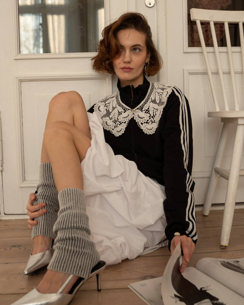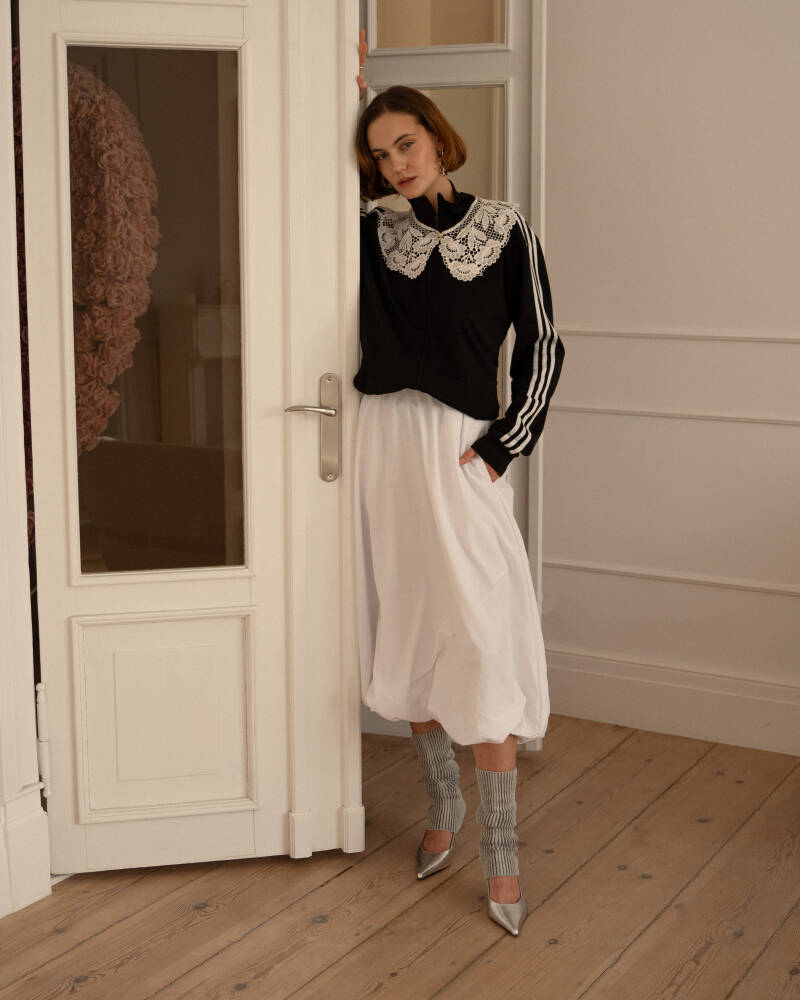 Stylizacja łączy klasyke z nowoczesnością, tworząc nietuzinkowy balans miedzy elegancja a streetwearem. Balonowa spodnica za kolano, wykonana z materialu przypominajacego luksusowa posciel, pięknie sie układa, nadając sylwetce objętości i lekkości. W kontrze do jej strukturalnej formy pojawia się sportowa bluza Adidasa, która dodaje casualowego, nonszalanckiego charakteru. Całość podkreśla ręcznie wykonany, szydełkowy, vintagowy skarb znaleziony lata temu na Vinted, oraz metaliczne szpilki, które dodają blasku i elegancji. To stylizacja dla tych, którzy lubia bawic sie moda i przełamywać schematy.